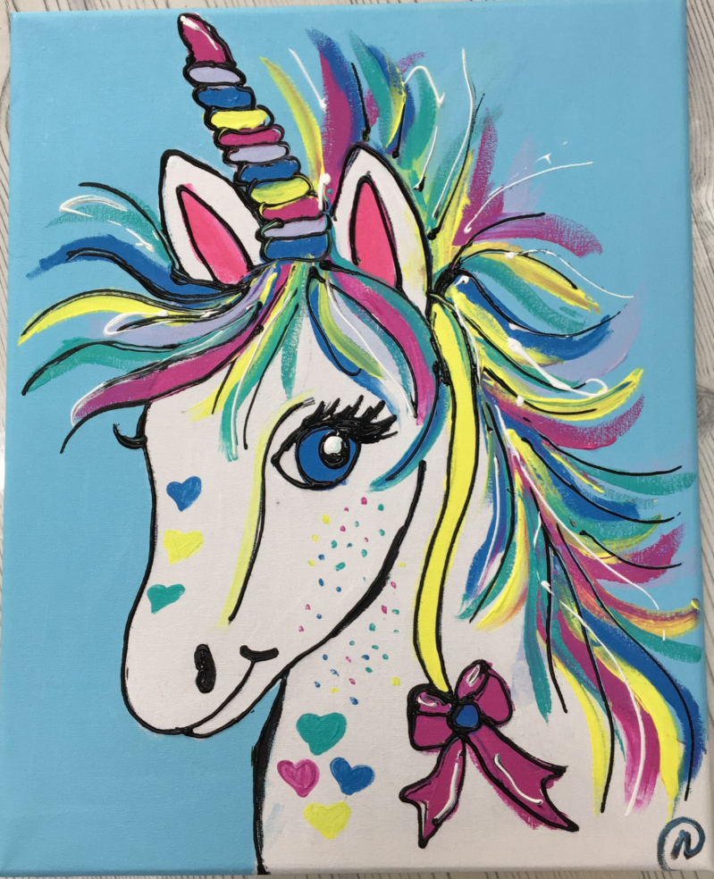Tijdens deze KidsArtParty maken de kinderen hun eigen Unicornschilderij op een doek van 30x40 of 40x50.